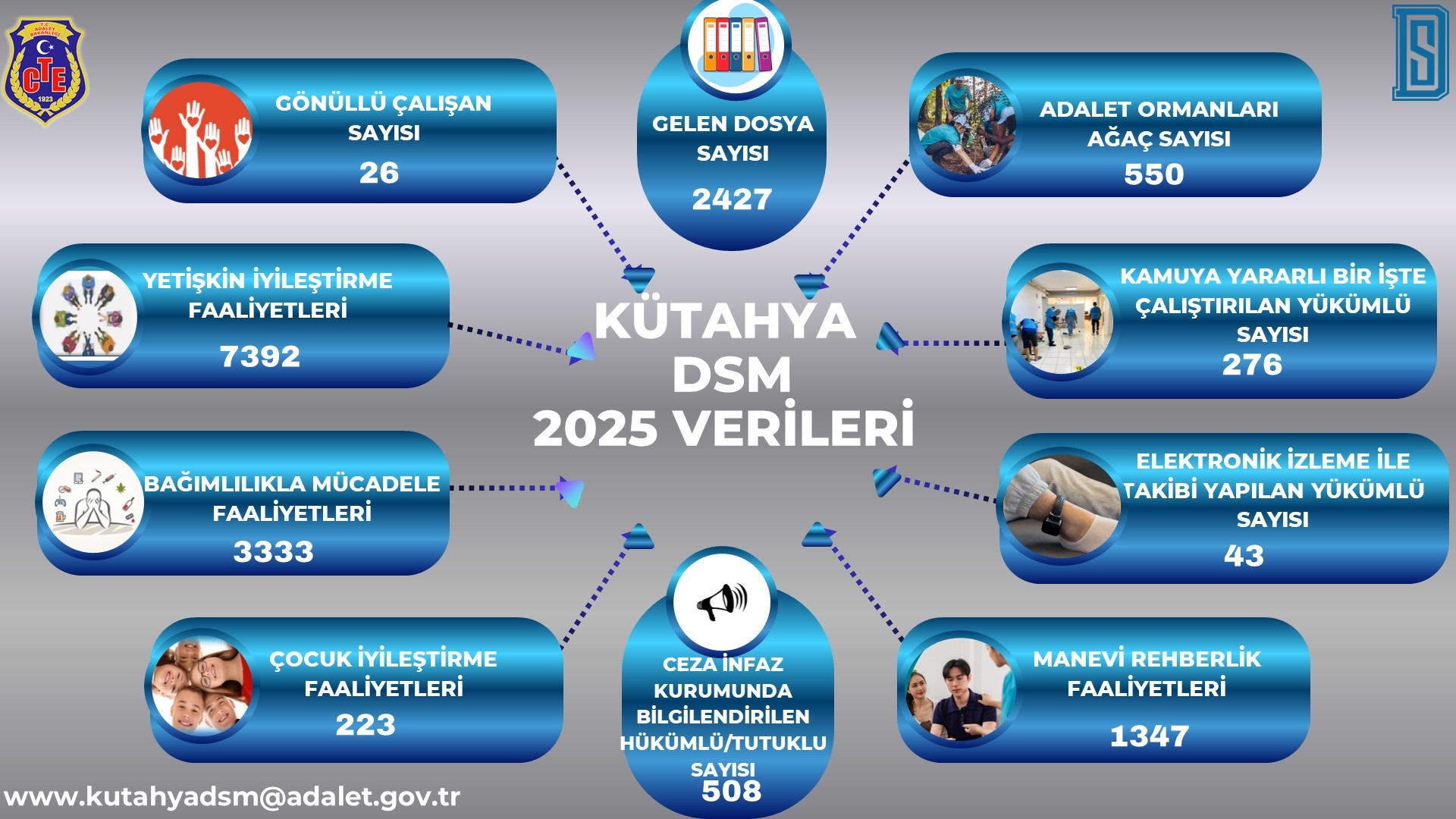 Kütahya Denetimli Serbestlik Müdürlüğü, 2025 yılı boyunca rehabilitasyon, topluma yeniden kazandırma, kamu yararına çalışma ve sosyal sorumluluk odaklı faaliyetlerini etkin ve sürdürülebilir bir şekilde yürütmüştür.